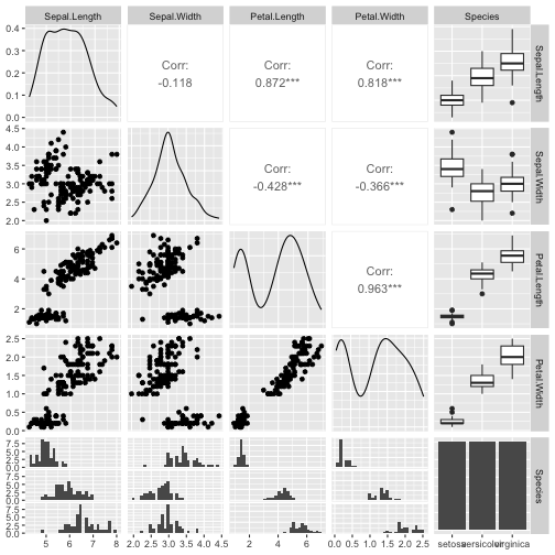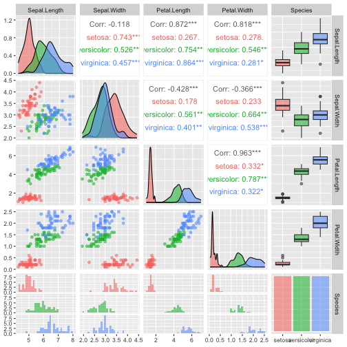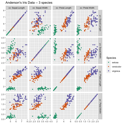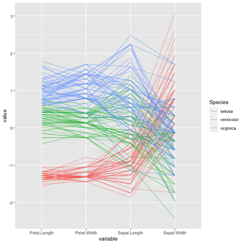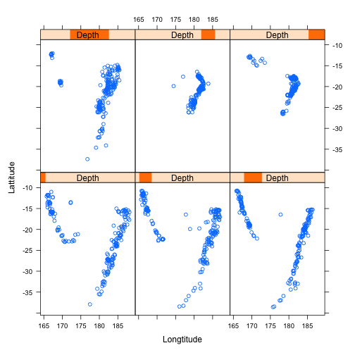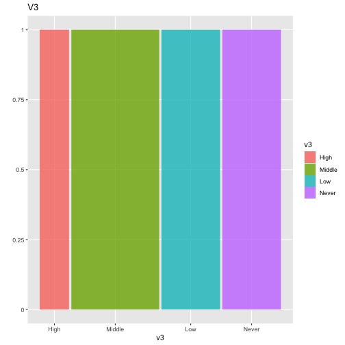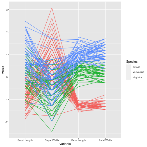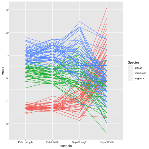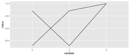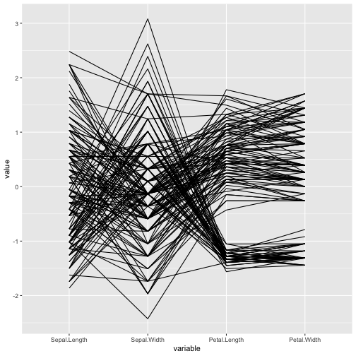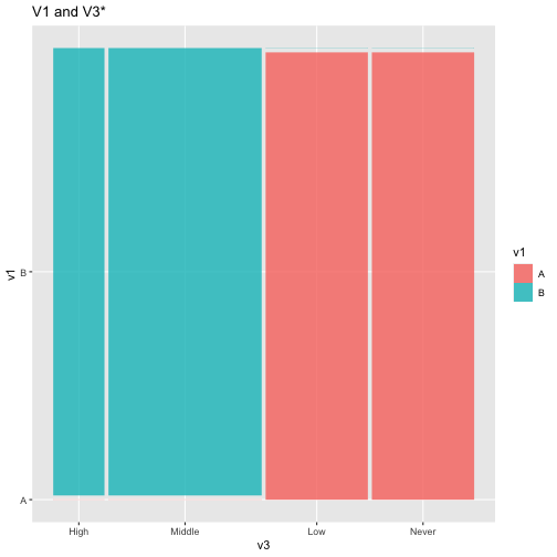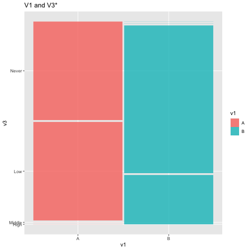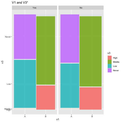 class: center, middle, inverse, title-slide .title[ # ASP 460 2.0 Data Visualisation ] .subtitle[ ## Higher-dimensional Displays and Special Structures ] .author[ ### Thiyanga Talagala ] --- ## Higher-dimensional Displays and Special Structures - Scatterplot Matrices (Sploms) - Parallel Coordinates - Mosaic Plots - Small Multiples and Trellis Displays - Time Series --- ## Scatterplot Matrices <!-- --> --- <!-- --> --- <!-- --> --- ```r set.seed(2020) x <- as.factor(c(rep(1, 100), rep(0, 100))) y <- as.factor(sample(x)) z <- as.factor(c(rep(1, 25), rep(2, 75), rep(3, 50), rep(4, 50))) x <- factor(x, label=c("A", "B")) y <- factor(y, label=c("Yes", "No")) z <- factor(z, label=c("High", "Middle", "Low", "Never")) df <- data.frame(v1=x, v2=y, v3=z) summary(df) ``` ``` v1 v2 v3 A:100 Yes:100 High :25 B:100 No :100 Middle:75 Low :50 Never :50 ``` --- ```r table(df$v1,df$v2) ``` ``` Yes No A 54 46 B 46 54 ``` ```r table(df$v1, df$v3) ``` ``` High Middle Low Never A 0 0 50 50 B 25 75 0 0 ``` ```r table(df$v2, df$v3) ``` ``` High Middle Low Never Yes 12 34 28 26 No 13 41 22 24 ``` --- # Mosaic Plot (1 ~ X) .pull-left[ ``` Yes No A 54 46 B 46 54 ``` ``` High Middle Low Never A 0 0 50 50 B 25 75 0 0 ``` ``` High Middle Low Never Yes 12 34 28 26 No 13 41 22 24 ``` ] .pull-right[ ```r library(ggmosaic) ggplot(df)+ geom_mosaic(aes(x=product(v1)))+ ggtitle("V1") ``` <!-- --> ] --- # Mosaic Plot (1 ~ X) .pull-left[ ``` v1 v2 v3 A:100 Yes:100 High :25 B:100 No :100 Middle:75 Low :50 Never :50 ``` ``` Yes No A 54 46 B 46 54 ``` ``` High Middle Low Never A 0 0 50 50 B 25 75 0 0 ``` ``` High Middle Low Never Yes 12 34 28 26 No 13 41 22 24 ``` ] .pull-right[ ```r ggplot(df)+ geom_mosaic(aes(x=product(v1), fill=v1))+ ggtitle("V1") ``` <!-- --> ] --- # Mosaic Plot (1 ~ X) .pull-left[ ``` v1 v2 v3 A:100 Yes:100 High :25 B:100 No :100 Middle:75 Low :50 Never :50 ``` ``` Yes No A 54 46 B 46 54 ``` ``` High Middle Low Never A 0 0 50 50 B 25 75 0 0 ``` ``` High Middle Low Never Yes 12 34 28 26 No 13 41 22 24 ``` ] .pull-right[ ```r ggplot(df)+ geom_mosaic(aes(x=product(v3), fill=v3))+ ggtitle("V3") ``` <!-- --> ] --- # Mosaic Plot (1 ~ Y + X) .pull-left[ ``` v1 v2 v3 A:100 Yes:100 High :25 B:100 No :100 Middle:75 Low :50 Never :50 ``` ``` Yes No A 54 46 B 46 54 ``` ``` High Middle Low Never A 0 0 50 50 B 25 75 0 0 ``` ``` High Middle Low Never Yes 12 34 28 26 No 13 41 22 24 ``` ] .pull-right[ ```r ggplot(df)+ geom_mosaic(aes(x=product(v1, v2), fill=v2))+ggtitle("V1 and V2*") ``` ``` Warning: `unite_()` was deprecated in tidyr 1.2.0. Please use `unite()` instead. ``` <!-- --> ] --- # Mosaic Plot (1 ~ Y + X) .pull-left[ ``` v1 v2 v3 A:100 Yes:100 High :25 B:100 No :100 Middle:75 Low :50 Never :50 ``` ``` Yes No A 54 46 B 46 54 ``` ``` High Middle Low Never A 0 0 50 50 B 25 75 0 0 ``` ``` High Middle Low Never Yes 12 34 28 26 No 13 41 22 24 ``` ] .pull-right[ ```r ggplot(df)+ geom_mosaic(aes(x=product(v1, v2), fill=v1))+ggtitle("V1* and V2") ``` <!-- --> ] --- # Mosaic Plot (1 ~ Y + X) .pull-left[ ``` v1 v2 v3 A:100 Yes:100 High :25 B:100 No :100 Middle:75 Low :50 Never :50 ``` ``` Yes No A 54 46 B 46 54 ``` ``` High Middle Low Never A 0 0 50 50 B 25 75 0 0 ``` ``` High Middle Low Never Yes 12 34 28 26 No 13 41 22 24 ``` ] .pull-right[ ```r ggplot(df)+ geom_mosaic(aes(x=product(v1, v3), fill=v1))+ggtitle("V1 and V3*") ``` <!-- --> ] --- # Mosaic Plot (1 ~ Y + X) .pull-left[ ``` v1 v2 v3 A:100 Yes:100 High :25 B:100 No :100 Middle:75 Low :50 Never :50 ``` ``` Yes No A 54 46 B 46 54 ``` ``` High Middle Low Never A 0 0 50 50 B 25 75 0 0 ``` ``` High Middle Low Never Yes 12 34 28 26 No 13 41 22 24 ``` ] .pull-right[ ```r ggplot(df)+ geom_mosaic(aes(x=product(v3, v1), fill=v1))+ggtitle("V1 and V3*") ``` <!-- --> ] --- # Mosaic Plot (1 ~ Y + X) .pull-left[ ``` v1 v2 v3 A:100 Yes:100 High :25 B:100 No :100 Middle:75 Low :50 Never :50 ``` ``` Yes No A 54 46 B 46 54 ``` ``` High Middle Low Never A 0 0 50 50 B 25 75 0 0 ``` ``` High Middle Low Never Yes 12 34 28 26 No 13 41 22 24 ``` ] .pull-right[ ```r ggplot(df)+ geom_mosaic(aes(x=product(v3, v1), fill=v3))+ggtitle("V1 and V3*") ``` <!-- --> ] --- # Mosaic Plot (1 ~ Y + X|Z) .pull-left[ ``` High Middle Low Never A 0 0 28 26 B 12 34 0 0 ``` ``` High Middle Low Never A 0 0 22 24 B 13 41 0 0 ``` ] .pull-right[ ```r ggplot(df)+ geom_mosaic(aes(x=product(v3, v1), fill=v3))+ggtitle("V1 and V3*") + facet_wrap(~v2) ``` <!-- --> ] --- # Conditioning plots (Coplots) ## Trellis Graphics - Grid graphic system - The idea is based on conditioning on the values taken on by one or more of the variables in a data set. - Categorical: same subplot for levels of the conditioning variable - Numeric: same subplot for different ranges (intervals) of the conditioning variable --- # Trellis Graphics: Categorical <!-- --> --- # Trellis Graphics: Numeric `quakes`: magitude of earthquakes under the Tonga Trench, to the North of New Zealand. ```r str(quakes) ``` ``` 'data.frame': 1000 obs. of 5 variables: $ lat : num -20.4 -20.6 -26 -18 -20.4 ... $ long : num 182 181 184 182 182 ... $ depth : int 562 650 42 626 649 195 82 194 211 622 ... $ mag : num 4.8 4.2 5.4 4.1 4 4 4.8 4.4 4.7 4.3 ... $ stations: int 41 15 43 19 11 12 43 15 35 19 ... ``` ```r library(lattice) ``` --- # Trellis Graphics: Numeric <!-- --> --- .pull-left[ ## Unconditional plot <!-- --> ] .pull-right[ ## Conditional plot <!-- --> Condition on `depth` ] --- # Coplots using ggplot .pull-left[ <!-- --> ] .pull-right[ <!-- --> ] --- # Coplots using ggplot .pull-left[ <!-- --> ] .pull-right[ <!-- --> ] --- # Parallel Coordinates Plots ```r df1 <- data.frame(x=c(1, 2), y=c(20, 10), z=c(10, 10)) df1 ``` ``` x y z 1 1 20 10 2 2 10 10 ``` <!-- --> --- <!-- --> --- <!-- --> --- <!-- --> --- <!-- --> --- <!-- --> --- ## ggparcoord: scales The different types of scales are as follows: `std`: univariately, subtract mean and divide by standard deviation `robust`: univariately, subtract median and divide by median absolute deviation `uniminmax`: univar