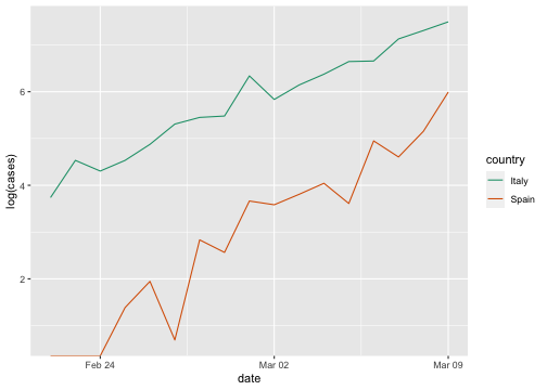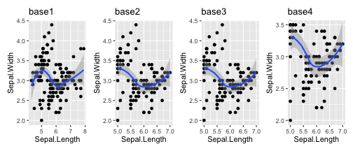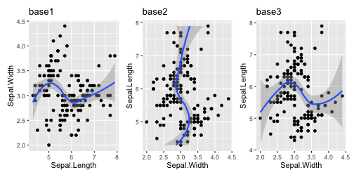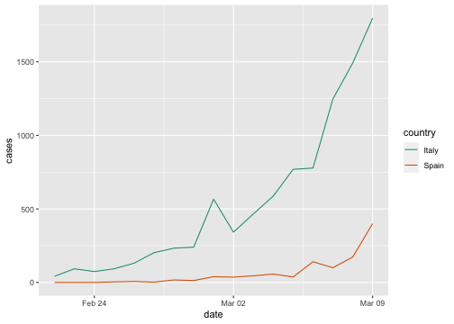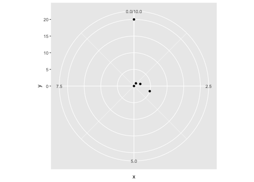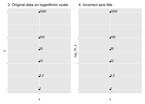 class: center, middle, inverse, title-slide # ASP 460 2.0 Special Topics in Statistics ## Coordinate Systems and Axes ### Thiyanga Talagala ### 2020-05-19 --- # Introduction - Position scales: How to place data points in the plot. <!--To make any sort of data visualization, we need to define position scales, which determine where in a graphic different data values are located. We cannot visualize data without placing different data points at different locations,--> - Arrangement of axes - horozontal x-axis and a vertical y-axis. - y-axis run at an acute angle relative to the x-axis. - one axis run in a circle and the other run radially. <!--For example, we could have the y axis run at an acute angle relative to the x axis--> ## Definition: coordinate systems "The combination of a set of position scales and their relative geometric arrangement is called a coordinate system." (Claus O. Wilke) --- # Cartesian Coordinates ## 2D Cartesian coordinate system - Two orthogonal axes (horizontal x-axis, vertical y-axis). <!--The most widely used coordinate system for data visualization is the 2D Cartesian coordinate system.--> - If X and Y axes are measured in the same units, the grid spacing for the two axes should be equal. The plot area should be a perfect square. .pull-left[ ```r library(ggplot2) ggplot(data=iris, aes(x=Sepal.Length, y=Sepal.Width))+ geom_point()+ * theme(aspect.ratio = 1) ``` ] .pull-right[ <!-- --> ] --- # 2D Cartesian coordinate system (cont.) Cartesian coordinate systems are invariant under linear transformations. <!-- What happens if you change the units of your data? A change in units is a linear transformation, where we add or substract a number to or from all data values and/or multiply all data values with another number. Cartisian coordinate systems are invariant under such linear transformations. Therefore, you can change the units of your data and the resulting figures will not change as long as you change the axes accordingly.Even though the grid lines are in different locations and the numbers along the axes are different, the two data visualizations look exactly the same.--> .pull-left[ ```r library(ggplot2) ggplot(data=iris, aes(x=Sepal.Length, y=Sepal.Width))+ geom_point()+theme(aspect.ratio = 1) ``` <!-- --> ] .pull-right[ ```r library(ggplot2) ggplot(data=iris, aes(x=Sepal.Length*100, y=Sepal.Width*100))+ geom_point()+theme(aspect.ratio = 1) ``` <!-- --> ] --- # 2D Cartesian coordinate system (cont) When two different types of variables are mapped to `\(X\)` and `\(Y\)` the plotting area can be stretched or compressed one relative to the other to maintain a valid visualization of the data. Example: X-Temperature, Y-Date <!-- --> --- # 2D Cartesian coordinate system (cont) .pull-left[ **Square grid** <!-- --> ] .pull-right[ **Rectangular grid** <img src="lecture7_files/figure-html/unnamed-chunk-7-1.png" width="200%" /> <img src="lecture7_files/figure-html/unnamed-chunk-8-1.png" width="200%" /> ] --- # Nonlinear Axes ```r x <- c(1, 3.2, 12, 35, 100, 1000); x ``` ``` [1] 1.0 3.2 12.0 35.0 100.0 1000.0 ``` ```r log_10_x <- log(x, base=10); log_10_x ``` ``` [1] 0.000000 0.505150 1.079181 1.544068 2.000000 3.000000 ``` <!-- --> <!--The first is to respond to skewness towards large values; i.e., cases in which one or a few points are much larger than the bulk of the data--> --- # Nonlinear Axes (Cont.) .pull-left[ <!-- --> ] .pull-right[ <!-- --> ] - Frist 3 plots are correct. Fourth graph is incorrect. - No difference between plotting the log-transformed data on a linear scale or plotting the original data on a logarithmic scale. The only difference lies in labelling values. - First two are preferable. - Third graph: high mental burden when reading the graph. <!--Mathematically, there is no difference between plotting the log-transformed data on a linear scale or plotting the original data on a logarithmic scale. The only difference lies in the labeling for the individual axis ticks and for the axis as a whole. In most cases, the labeling for a logarithmic scale is preferable, because it places less mental burden on the reader to interpret the numbers shown as the axis tick labels. There is also less of a risk of confusion about the base of the logarithm. When working with log-transformed data, we can get confused about whether the data was transformed using the natural logarithm or the logarithm to base 10. And it’s not uncommon for labeling to be ambiguous—e.g., log(x), which doesn’t specify a base at all. I recommend that you always verify the base when working with log-transformed data. When plotting log-transformed data, always specify the base in the labeling of the axis.--> --- # Transformations Both logarithm scale and square-root scale compresses larger range into a smaller range. - Logarithmic scales > When the dataset contains wide range of values. <!--There are two main reasons to use logarithmic scales in charts and graphs. The first is to respond to skewness towards large values; i.e., cases in which one or a few points are much larger than the bulk of the data. The second is to show percent change or multiplicative factors.--> - Square-root scale > When data contains 0, use square-root transformation. --- # Logarithmic scales Logarithmic scales can emphasize the rate of change in a way that linear scales do not. Italy seems to be slowing the corona virus infection rate, while the number of cases in Spain continues to double every few days. .pull-left[ <!-- --> ] .pull-right[ <!-- --> ] <!--At a quick glance, the rate of spread in the Spain looks similar to Italy’s, at least when plotted on a linear scale. But on a logarithmic scale, it is instantly apparent that the number of Americans becoming infected continues to double every three days or so. That indicates that the limited measures taken until recently did not sever social contact enough to slow the spreading. The U.S. curve has even bent upward in the last few days — an even faster ex