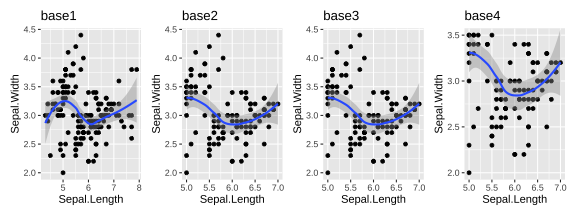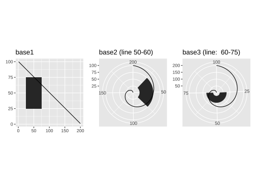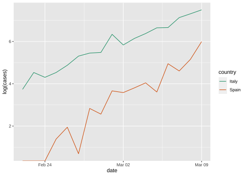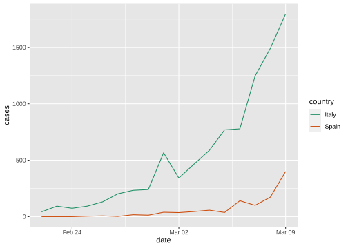class: center, middle, inverse, title-slide # ASP 460 2.0 Data Visualization ### Dr Thiyanga Talagala ### 5. Coordinate Systems and Axes --- # Introduction - Position scales: How to place data points in the plot. <!--To make any sort of data visualization, we need to define position scales, which determine where in a graphic different data values are located. We cannot visualize data without placing different data points at different locations,--> - Arrangement of axes - horozontal x-axis and a vertical y-axis. - y-axis run at an acute angle relative to the x-axis. - one axis run in a circle and the other run radially. <!--For example, we could have the y axis run at an acute angle relative to the x axis--> ## Definition: coordinate systems "The combination of a set of position scales and their relative geometric arrangement is called a coordinate system." (Claus O. Wilke) --- class: middle, inverse, center # Cartesian Coordinates --- ### 2D Cartesian coordinate system - Two orthogonal axes (horizontal x-axis, vertical y-axis). <!--The most widely used coordinate system for data visualization is the 2D Cartesian coordinate system.--> - If X and Y axes are measured in the same units, the grid spacing for the two axes should be equal. The plot area should be a perfect square. .pull-left[ ```r library(ggplot2) ggplot(data=iris, aes(x=Sepal.Length, y=Sepal.Width))+ geom_point()+ * theme(aspect.ratio = 1) ``` ] .pull-right[ <!-- --> ] --- ### 2D Cartesian coordinate system (cont.) Cartesian coordinate systems are invariant under linear transformations. <!-- What happens if you change the units of your data? A change in units is a linear transformation, where we add or substract a number to or from all data values and/or multiply all data values with another number. Cartisian coordinate systems are invariant under such linear transformations. Therefore, you can change the units of your data and the resulting figures will not change as long as you change the axes accordingly.Even though the grid lines are in different locations and the numbers along the axes are different, the two data visualizations look exactly the same.--> .pull-left[ ```r ggplot(data=iris, aes(x=Sepal.Length, y=Sepal.Width))+ geom_point()+theme(aspect.ratio = 1) ``` <!-- --> ] .pull-right[ ```r ggplot(data=iris, aes(x=Sepal.Length*100, y=Sepal.Width*100))+ geom_point()+theme(aspect.ratio = 1) ``` <!-- --> ] --- ### 2D Cartesian coordinate system (cont) When two different types of variables are mapped to `\(X\)` and `\(Y\)` the plotting area can be stretched or compressed one relative to the other to maintain a valid visualization of the data. Example: X-Temperature, Y-Date <!-- --> --- ### 2D Cartesian coordinate system (cont) .pull-left[ **Square grid** <img src="lesson5viz2021_files/figure-html/unnamed-chunk-6-1.png" width="70%" /> ] .pull-right[ **Rectangular grid** <img src="lesson5viz2021_files/figure-html/unnamed-chunk-7-1.png" width="200%" /> <img src="lesson5viz2021_files/figure-html/unnamed-chunk-8-1.png" width="200%" /> ] --- # Nonlinear Axes ```r x <- c(1, 3.2, 12, 35, 100, 1000); x ``` ``` [1] 1.0 3.2 12.0 35.0 100.0 1000.0 ``` ```r log_10_x <- log(x, base=10); log_10_x ``` ``` [1] 0.000000 0.505150 1.079181 1.544068 2.000000 3.000000 ``` <!-- --> <!--The first is to respond to skewness towards large values; i.e., cases in which one or a few points are much larger than the bulk of the data--> --- ### Nonlinear Axes (Cont.) .pull-left[ <!-- --> ] .pull-right[ <!-- --> ] --- - Frist 3 plots are correct. Fourth graph is incorrect. - No difference between plotting the log-transformed data on a linear scale or plotting the original data on a logarithmic scale. The only difference lies in labelling values. - First two are preferable. - Third graph: high mental burden when reading the graph. <!--Mathematically, there is no difference between plotting the log-transformed data on a linear scale or plotting the original data on a logarithmic scale. The only difference lies in the labeling for the individual axis ticks and for the axis as a whole. In most cases, the labeling for a logarithmic scale is preferable, because it places less mental burden on the reader to interpret the numbers shown as the axis tick labels. There is also less of a risk of confusion about the base of the logarithm. When working with log-transformed data, we can get confused about whether the data was transformed using the natural logarithm or the logarithm to base 10. And it’s not uncommon for labeling to be ambiguous—e.g., log(x), which doesn’t specify a base at all. I recommend that you always verify the base when working with log-transformed data. When plotting log-transformed data, always specify the base in the labeling of the axis.--> --- # Transformations Both logarithm scale and square-root scale compresses larger range into a smaller range. - Logarithmic scales > When the dataset contains wide range of values. <!--There are two main reasons to use logarithmic scales in charts and graphs. The first is to respond to skewness towards large values; i.e., cases in which one or a few points are much larger than the bulk of the data. The second is to show percent change or multiplicative factors.--> - Square-root scale > When data contains 0, use square-root transformation. --- # Logarithmic scales Logarithmic scales can emphasize the rate of change in a way that linear scales do not. Italy seems to be slowing the corona virus infection rate, while the number of cases in Spain continues to double every few days. .pull-left[ <!-- --> ] .pull-right[ <!-- --> ] <!--At a quick glance, the rate of spread in the Spain looks similar to Italy’s, at least when plotted on a linear scale. But on a logarithmic scale, it is instantly apparent that the number of Americans becoming infected continues to double every three days or so. That indicates that the limited measures taken until recently did not sever social contact enough to slow the spreading